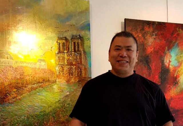 Né en 1965 à Hong Kong (CHINE), Michel Tong se passionne pour le dessin dès son plus jeune âge, après 6 ans, il suivit sa famille arrivée à Paris (FRANCE), la culture Chinoise et la culture européenne ont une grande influence sur sa peinture, voici un tableau de l’artiste, les montagnes bleus contrastent le ciel, la rivière rouge et orange, nous remémorent l’ancienne philosophie chinoise du YIN et du YANG, en même temps , les couleurs se combinent harmonieusement, cette peinture exprime une expérience qui traverse l’espace et le temps, donne des émotions à tous.