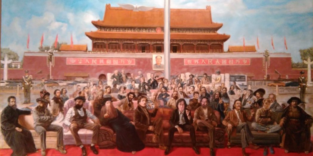 油画《我的梦》,画中其实有好几个梦。据他所说,首先是一个在实现和圆他一个青少年时期的梦,当他正在20来岁的时候,那时的他,正生活在中国温州,也经常与一帮同年龄的画友们一起在温州近郊一个叫杨府山江边农村写生作画,当时他把那儿比拟作法国的巴比松,那时的他也的确时常梦想着与这些世界级大师们生活在一起,画在一起,想在一起。第二个梦是作品中的和平鸽象征中国的和平崛起,画面中的柱子,象征顶天立地,坚不可摧的中坚力量。今天中国的工业,经济,文化及政治的全面崛起,已成为世界,也包括欧美发达国家在各方面力量中的中流砥柱,并已成为挽救世界经济危机的一股不可忽视的力量。第三,对于外国人来说,他果然是位画家,但更重要的是一位中国人,中国的文化向来是好客的,此时此刻天安门前铺着红地毯,画中的他代表中国人,坐在他们中间,欢迎他们。这些活在天堂上的世界级历代艺术大师们一游中国,他们分别是,第一排,从左到右:米开朗基罗,罗丹,莫奈,达芬奇,德拉克罗瓦,我,列宾,达利,尼古拉费欣,伦布朗。第二排:卡莎特,德加,塞尚,门采尔,莎金特,毕加索,马蒂斯,拉费尔,委拉斯贵智,鲁本斯,戈雅。还有一些分别在不同的地方,如:梵高,苏里科夫,芭芭拉,高根等等。如果这些大师们真的有幸来此欢聚一堂,那正是体现了大师们的开阔胸怀,对今天中国和平崛起是一个最正面的肯定,也充分体现了“世界人民大团结万岁”的现实意义。第四,他的确在做这个梦,梦想着:有一天也能成为他们中的一员。第五,画面蓝天白云一片,说明中国目前的环境污染问题已有所改善。第六,警察的把守,肯定了中华人民共和国政权的存在,充分展现了“中华人民共和国万岁”的深远的现实意义。